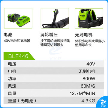格力博(greenworks)BLF446 40V背负吹风机风力灭火机工程路政鼓风机园林吹尘机大棚吹雪机吹树叶机2电1充