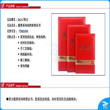 得力 7580-6K荣誉证书(载誉) 合上尺寸;210*295mm
