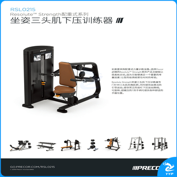 5、臂屈伸肱三头肌训练器专门针对三头肌和胸肌群,同时提供支撑式的引导运动,提供常见的双杠下压运动路线,可旋转、超模压的T形手柄可提供各种舒适的手握位置;