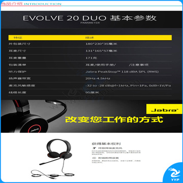 捷波朗 Jabra 统一通信耳麦 EVOLVE 20 MS Stereo 双耳 USB接口 可调音量/闭音/挂接/降噪 微软认证