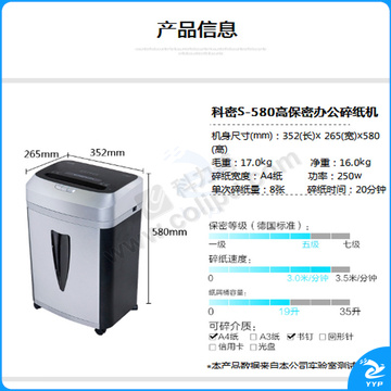 科密 Comet 碎纸机 S-580 19L 2*2mm 粉尘级 2级保密 长时间中大型办公