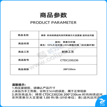 婵思 CHANSI 时尚刺绣迹风系列莱赛尔大豆夏被 CTDC230236 200*230cm 填充物成分:涤纶(聚酯纤维) 重量约1000g (迹风运河蓝)