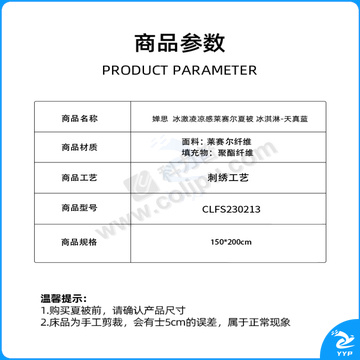 婵思 CHANSI 冰激凌凉感莱赛尔夏被 CLFS230213 150*200cm 填充物成分:涤纶(聚酯纤维) 重量约1000g (天真蓝)