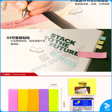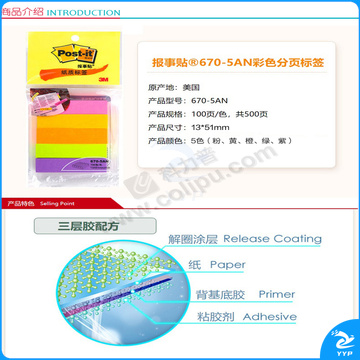 3M 纸质便利贴 670-5AN 13*51mm (荧光5色) 100页/条 5条/包