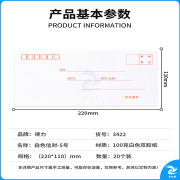 得力(deli)20张5号白色信封 邮局标准信封220*110mm3422-20