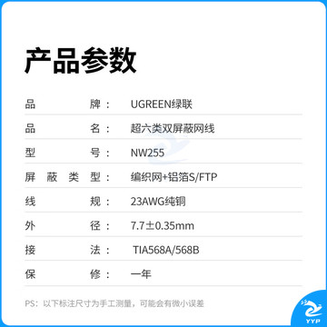 绿联(UGREEN) 超六类双屏蔽网线【0.58±0.008mm纯铜线芯】CAT6A万兆抗干扰降衰减 网络POE监控工程家装箱线50米