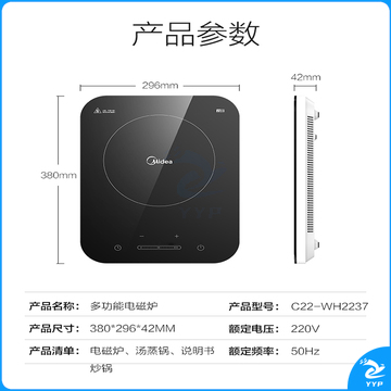 美的(Midea)电磁炉 家用大功率 2200W 恒匀火技术 智能断电 微晶面板 C22-WH2237