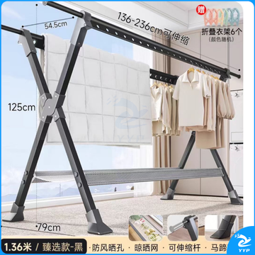 落地晾衣架移动单杆晾衣架伸缩不锈钢落地折叠1.3m*2.3m