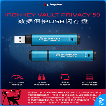 金士顿(Kingston)256GB USB3.2 Gen1 U盘 IKVP50 256位AES专业硬件金属加密 双重写保护 读速高达250MB/s