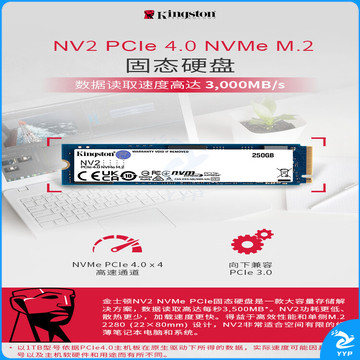 金士顿(Kingston) 2TB SSD固态硬盘 M.2接口(NVMe协议 PCIe 4.0×4)兼容PCIe3.0 NV2系列 读速高达3000MB/s