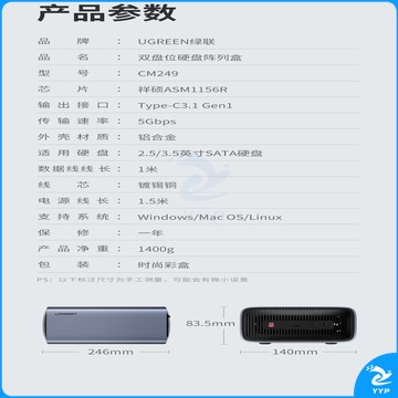 绿联 双盘位RAID磁盘阵列盒2.5/3.5英寸硬盘柜 SATA串口USB-C3.1机械固态SSD笔记本外接存储硬盘盒60532