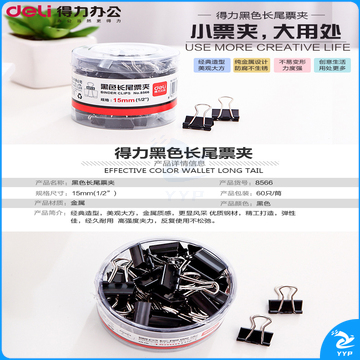 得力(deli)8566 15mm 黑色长尾票夹 金属票据夹 燕尾夹铁夹子 60只/筒