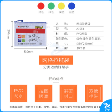 齐心(Comix) 10个装 A4防潮网格拉链袋/文件袋 A1054 颜色随机