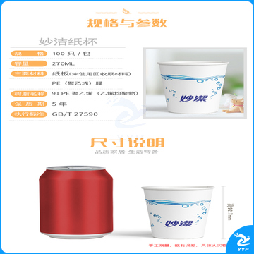 妙洁 纸杯 一次性纸杯 270ml 100只/包装 (每箱10包)