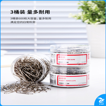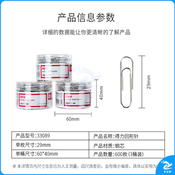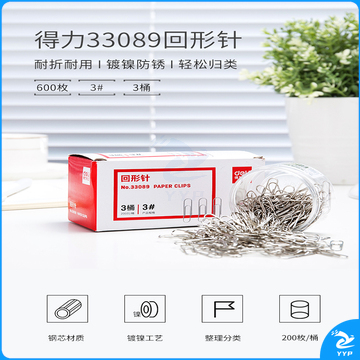 得力(deli)29mm镀镍回形针 3#金属曲别针 200枚/筒 3筒装 办公用品 33089