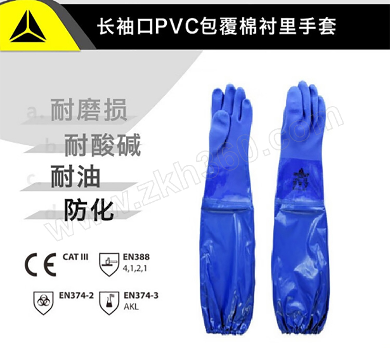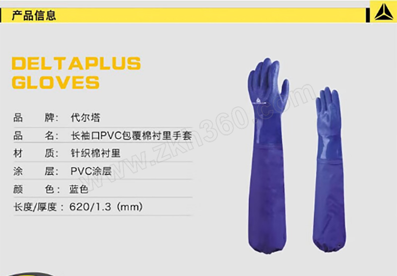 ·超长袖口PVC包覆棉衬里手套 ·长度620mm,厚度1.3mm ·100%13针织棉衬里,优质PVC涂层,在化学环境下提供有效防护,对绝大多数酸、 碱、油有较强的耐受性能 ·手套尾端弹性热焊接超长光滑袖口,尾部弹性收紧,便于穿戴,同时为流出的化学液体提供有效防护屏障,避免漏入手臂 ·舒适无缝植棉衬里,有效提 高手套抗磨损性能,并提供优异的舒适保障