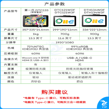 Wacom 和冠 数位屏 手绘屏 数位板 Wacom one手绘板 电脑绘图板 电脑手写板 手写板 DTH134W0F(仅Type-C视频接口使用